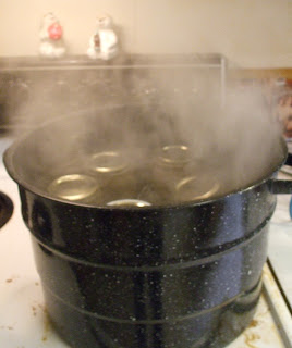 I put the whole mess into five pint canning jars, put on (new) lids and (old) rings, tightened them finger-tight and processed them for ten minutes in a boiling water bath.